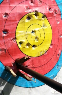 Questi i primi 6 tiri con freccia dal peso totale di 466grani compresa punta FIELD aumentada da 85 grani originali a 100 grani (i sei fori di impatto intorno alla freccia tre segnalati con stecchi e due con foro a vista rispettivamente a Dx e Sx freccia ).Distanza 60 Yardes vento trasversale DX di 1,5- 2KM/h traiettoria NON CORRETTA per valutazioni…