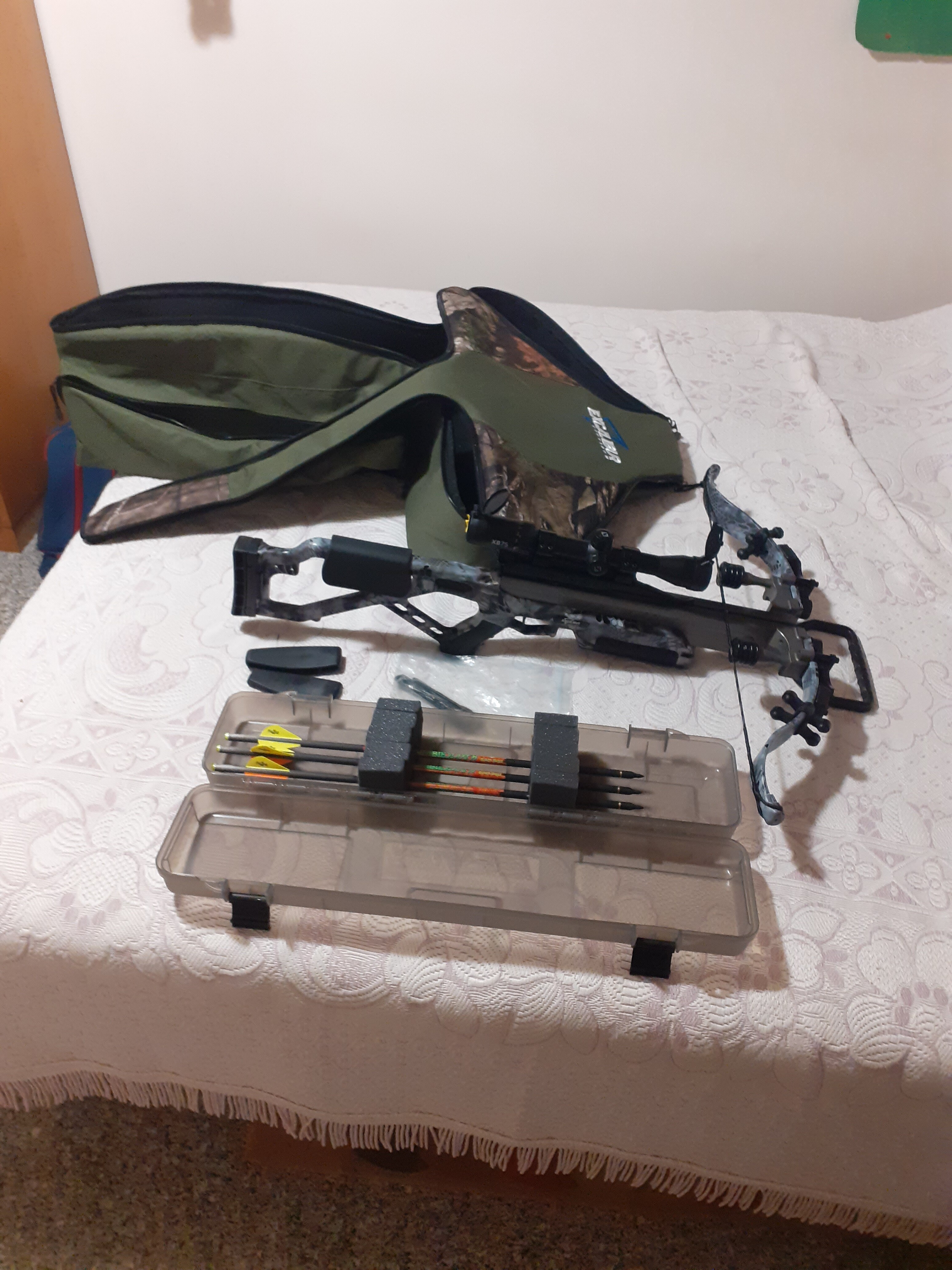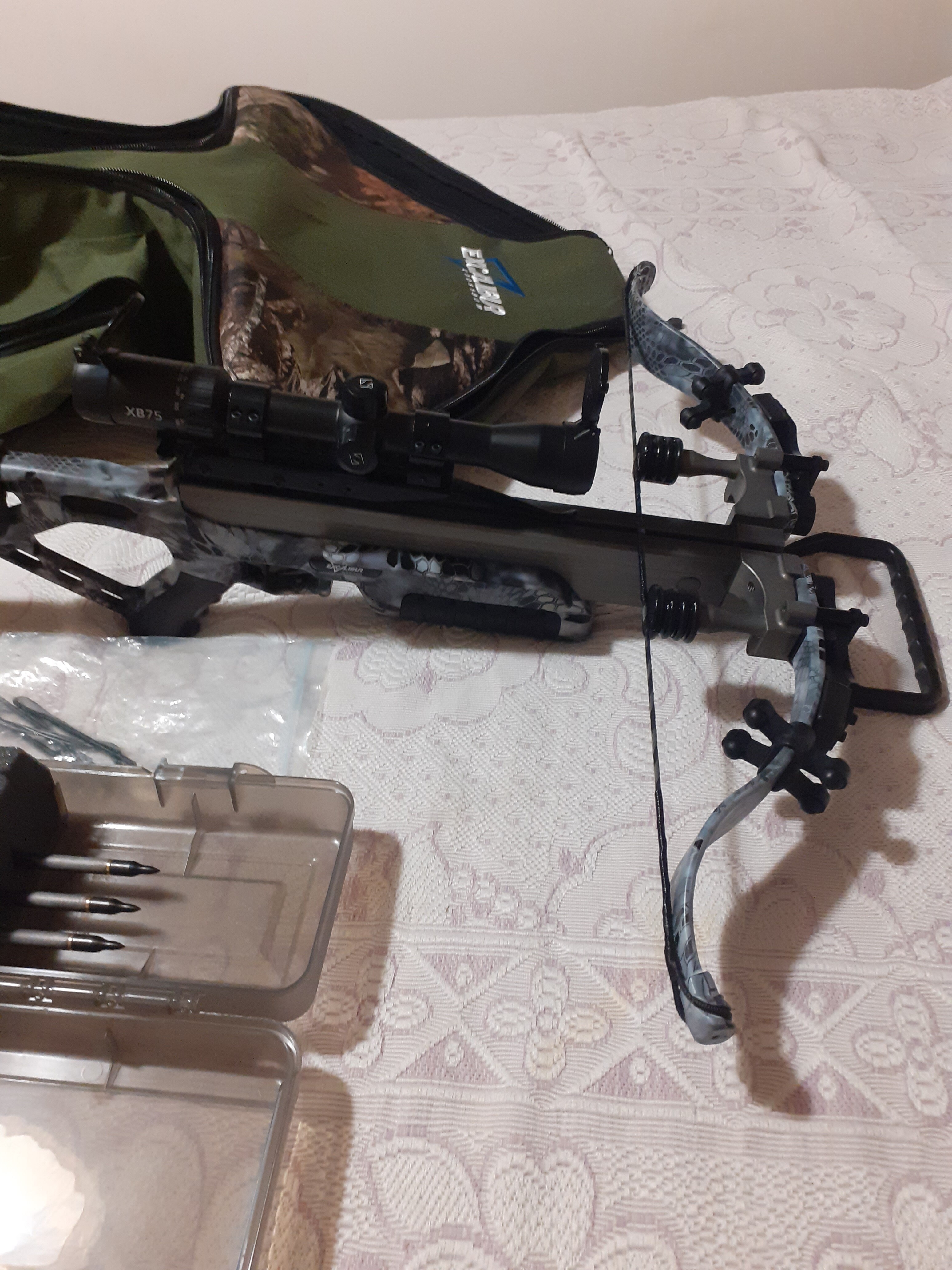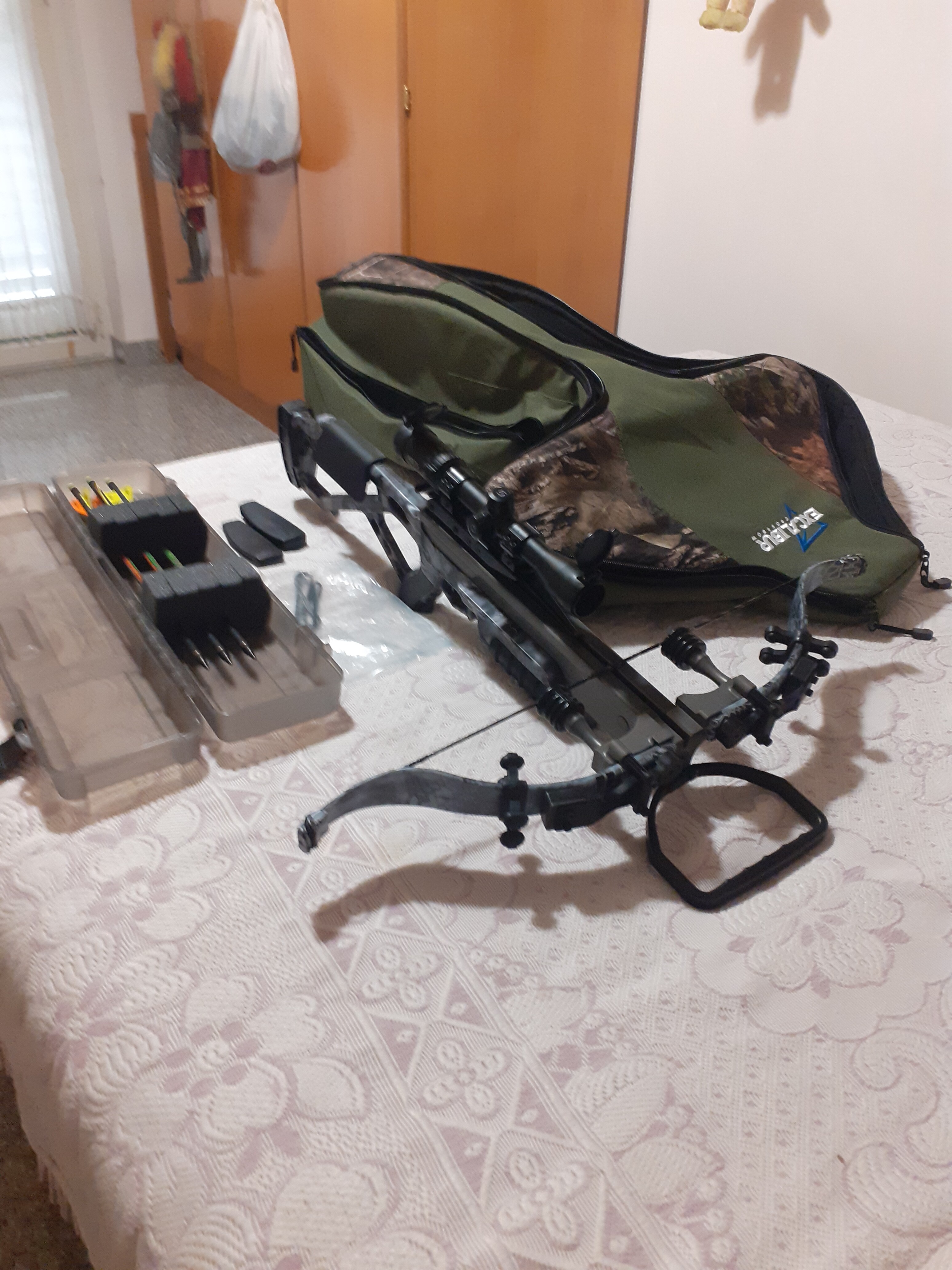 balestra Excalibur MICRO MAG 340, versione KRIPTEK RAID, 270 libbre, completa di ottica ZEISS TERRA XB75 2-7x32, coprilenti flip up BUTLER CREEK, custodia originale Excalibur CRYPT DELUXE, Excalibur AIR BRAKES SUPPRESSORS, Excalibur REDS SUPPRESSORS, Excalibur OVER-MOLDED RUBBERIZED STIRRUP, Excalibur R.A.V.S. LIMB SILENCERS, Excalibur AMBIDEXTROUS CHEEKPIECE, Excalibur STOCK X-TENDER a 3 spessori, 2 corde Excalibur MICRO, 3 dardi Black Eagle ZOMBIE SLAYER da 18" con punte Saunders COMBO da 150 grani (440 grani totali), custodia dardi in plastica Easton BOLT CASE da 12 posti.