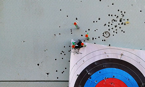 8) Anche qui la freccia numero 5 impattava sempre alta, mentre le altre 4 impattavano in maniera abbastanza uniforme, le tre frecce in basso (una è vicino al bordo del battifreccia) quelle bianco/nere sono quelle di Max che avendo sostituito l'impennaggio ha avuto qualche difficoltà di volo