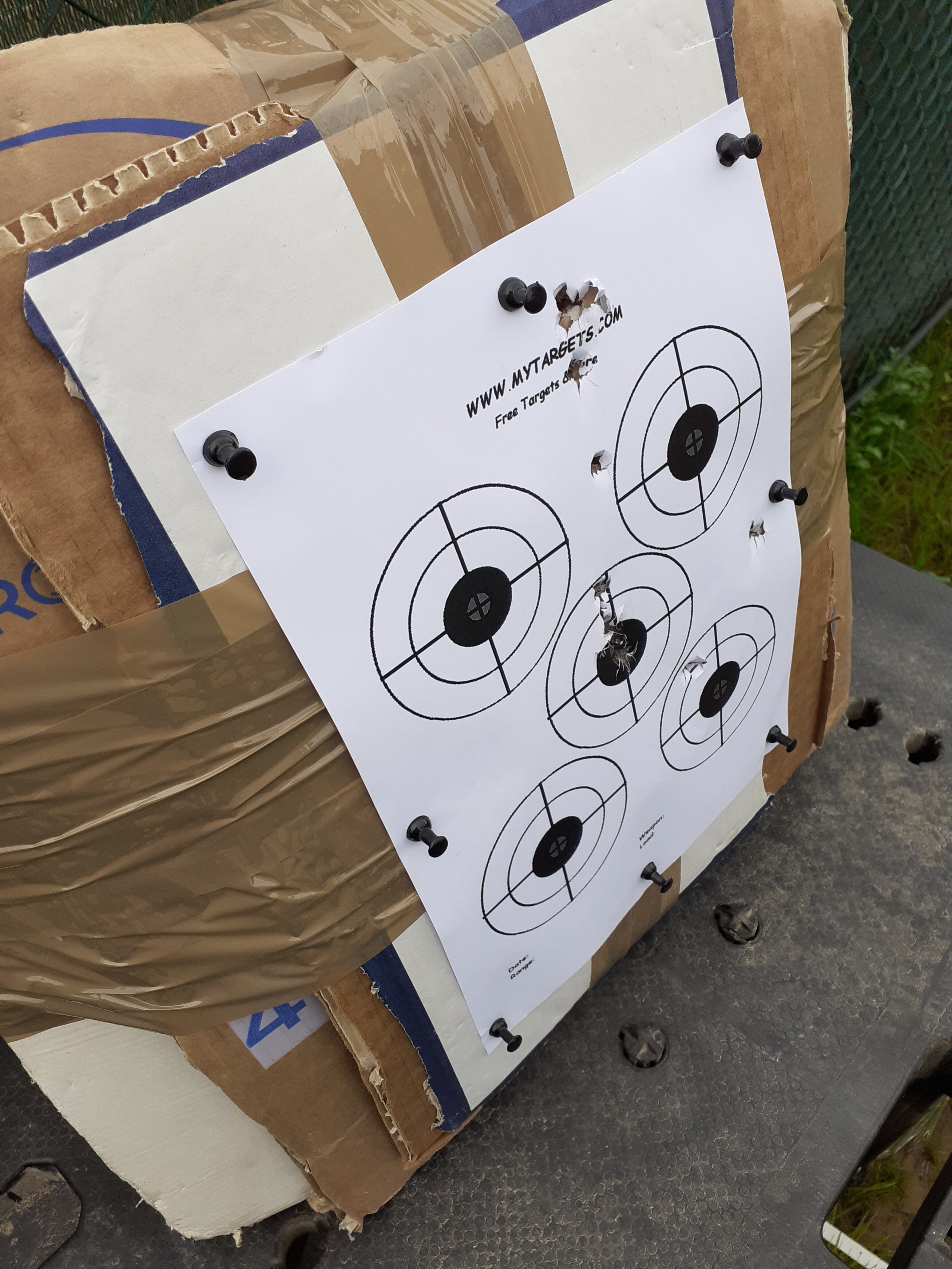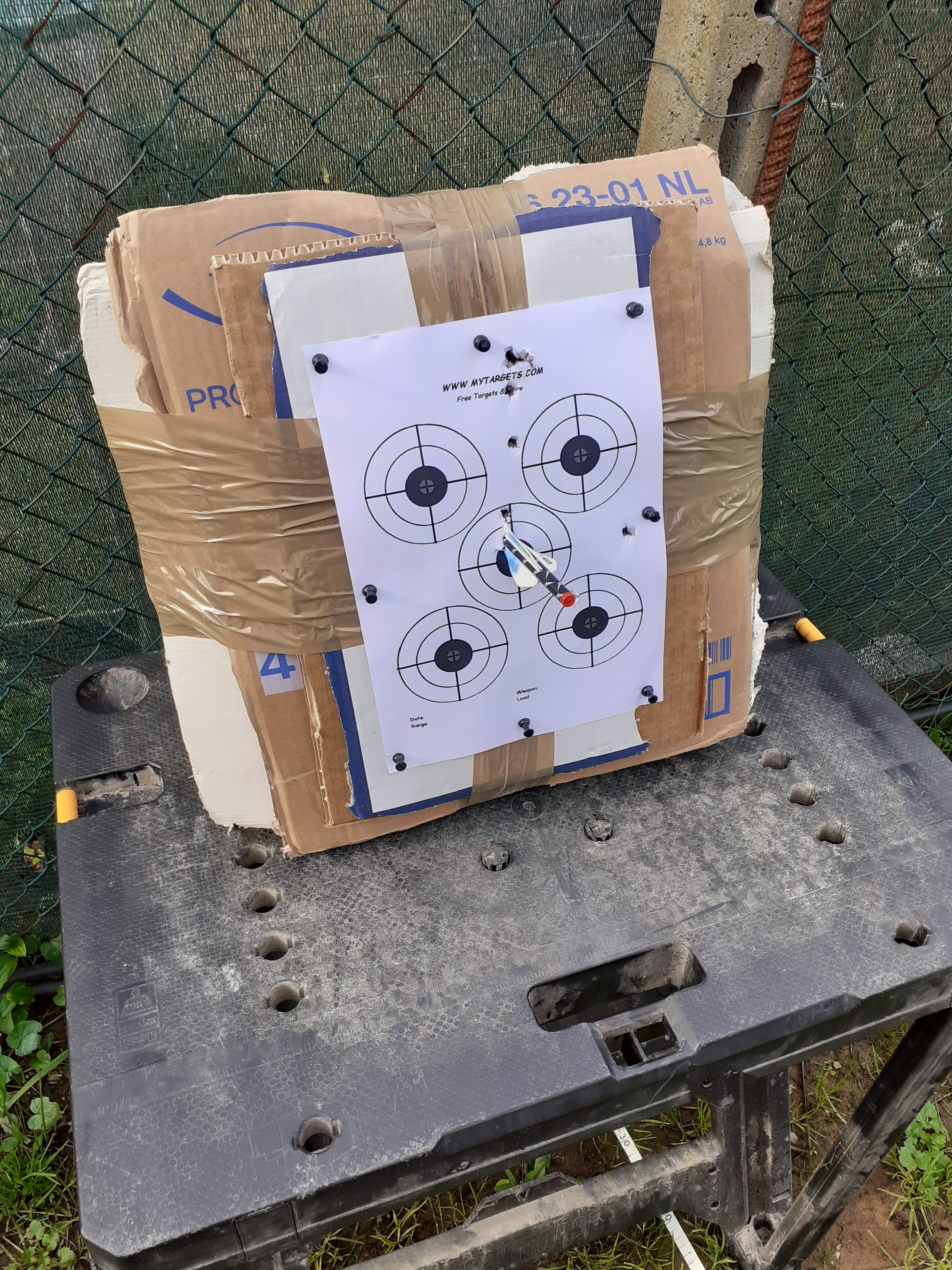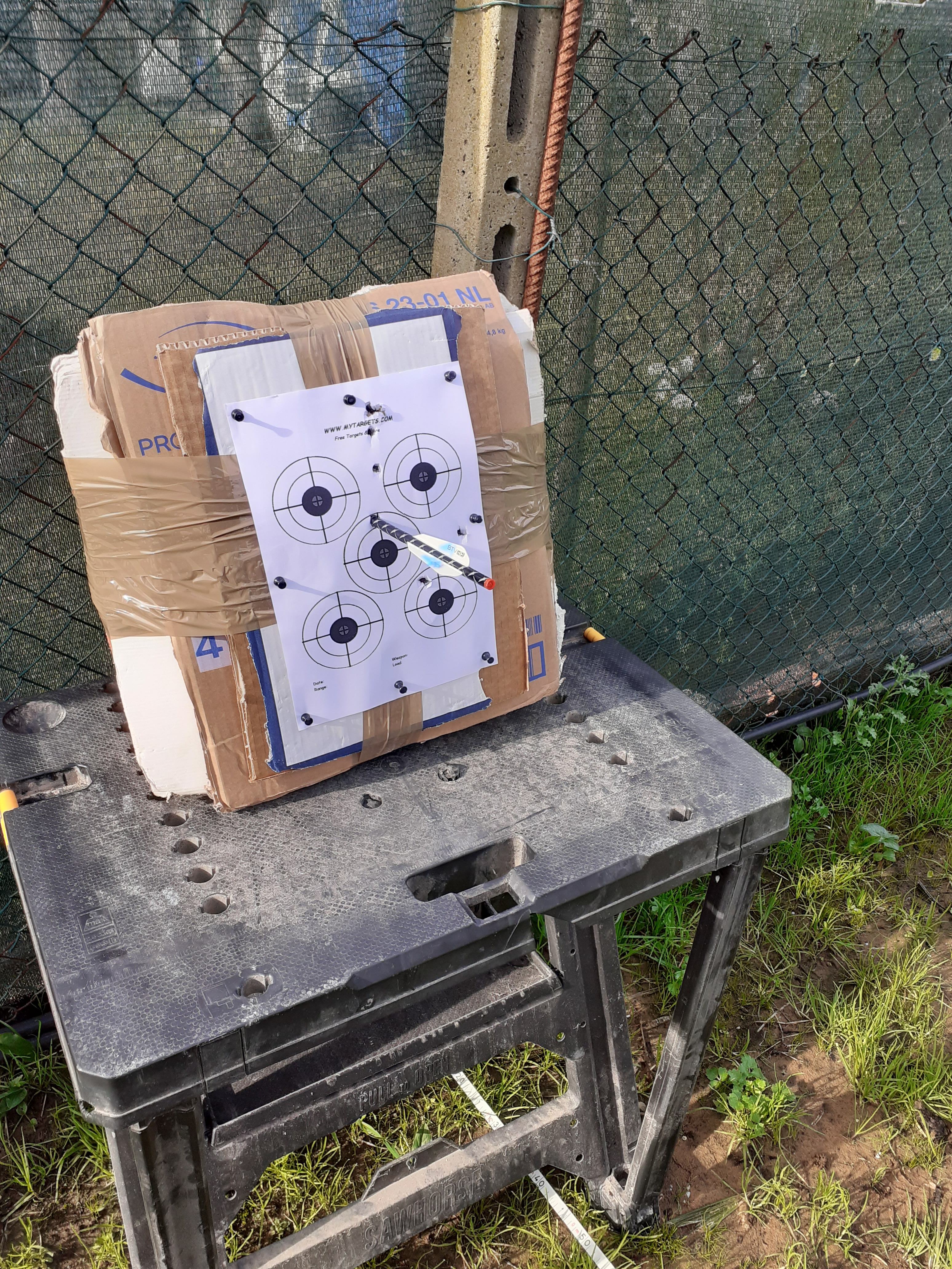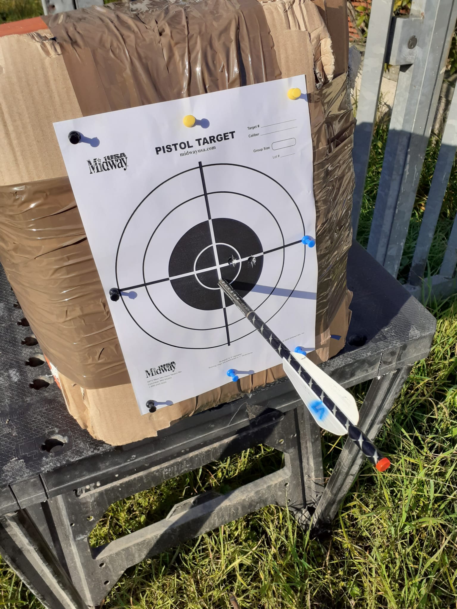 Tirando sempre la stessa freccia sono riuscito a beccare 4 volte di fila lo stesso foro, tanto che alla fine il mio battifreccia (circa 20 kg di stracci pressati in un vaso di plastica alto 45 cm con 12 cm di cartone sovrapposto tenuto insieme da scotch da imballaggi) si è sfondato.